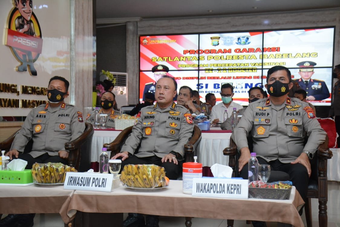 Selanjutnya kepada awak media Kabid Humas Polda Kepri menyampaikan tentang program Satlantas Polresta Barelang yaitu Program Garansi (Melanggar Tukar Vaksinasi). Program Garansi ini yaitu, jika anggota dilapangan temukan warga Batam yang melakukan pelanggaran lalu lintas, maka kita akan melakukan pengecekan, apakah mereka sudah melakukan vaksinasi atau belum, Kalau mereka belum vaksinasi, maka kita akan mengarahkannya untuk dilakukan vaksinasi. Tutup Kabid Humas Polda Kepri Kombes Pol. Harry Goldenhardt S., S.IK., M.Si.